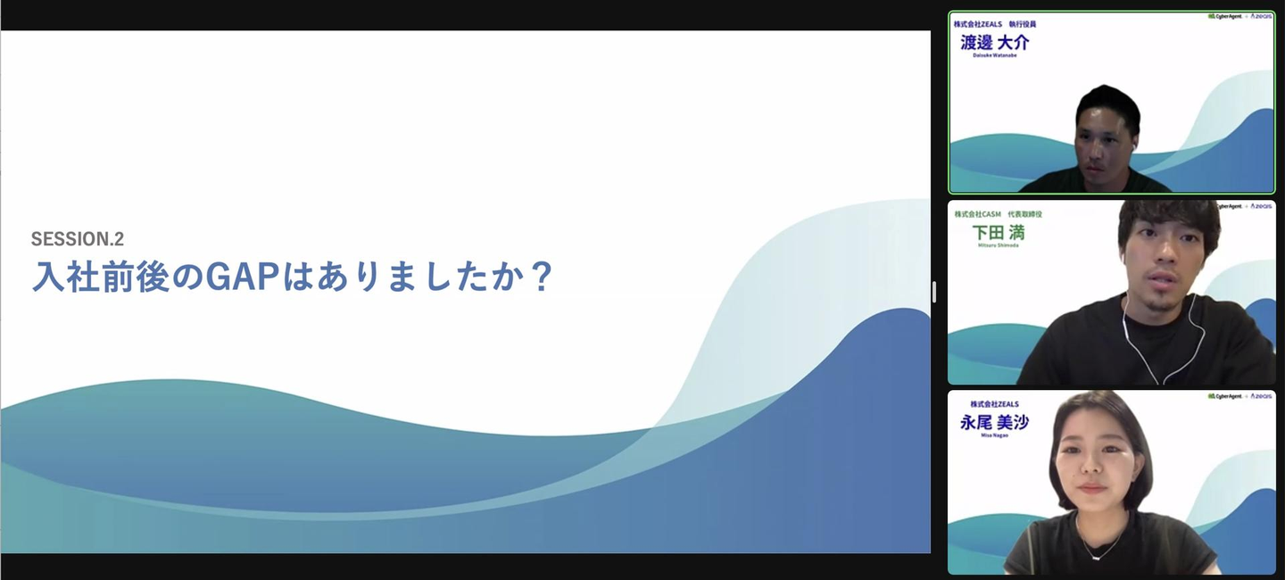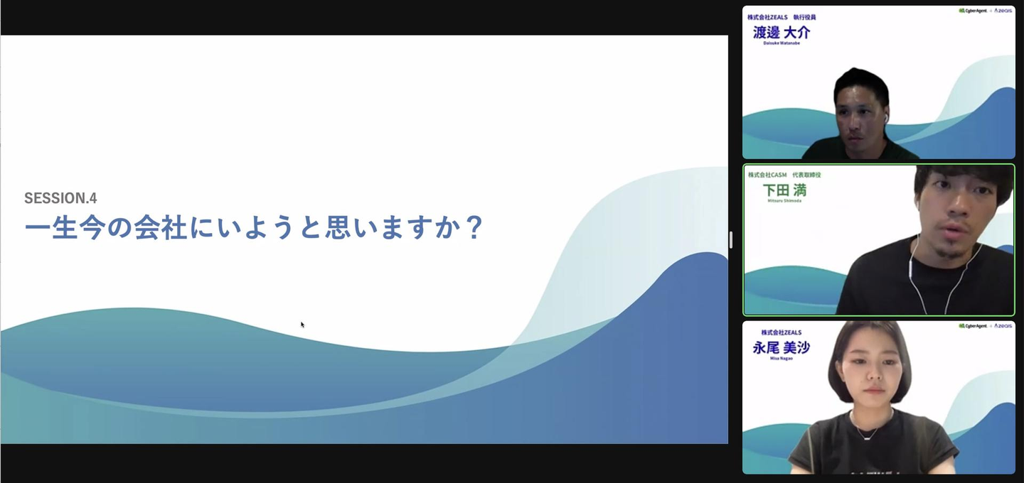 渡邊:今日は、2018年にサイバーエージェントに新卒入社し現在株式会社CASMで代表を務める下田さんと今年4月にジールスへ入社した永尾さんをゲストに迎え、一緒に会社の選び方やキャリア形成についてディスカッションしたいと思います。改めて、よろしくお願いします!