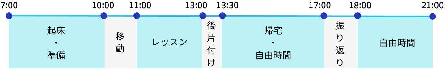 普段は会社員として働いている生徒さんの場合、レッスンは休日に行います。朝起きて準備に取り掛かり、荷物をまとめて生徒さんのお宅へ向かうという流れですね。午前からカウンセリングとヨガレッスンをして、その後マッサージまで行います。終わった後は片付け。そしてその日の用事に合わせてそのまま出かけたり、自宅に帰ったりします。帰った後はレッスンの振り返りをしつつ、自由に過ごしています。
