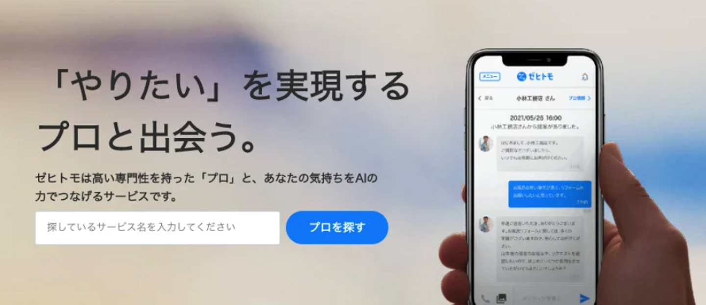ゼヒトモは、仕事をお願いしたい依頼者と、カメラマン、ヨガ講師、リフォームや工事事業者など様々な「プロ」をつなぐプラットフォームです。依頼者には、毎日の生活をサポートするものから今まで利用しようと考えたことがないような便利なサービスまで提供し、またプロには仕事の幅や可能性を広げ、日本のローカルサービス、そして働き方を変えていきます。