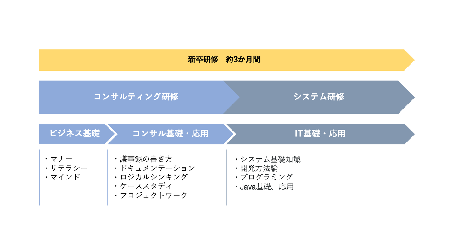 コンサルティング研修では、ビジネス基礎からロジカルシンキングやケーススタディまで、コンサルタントとしての基礎的な部分を学びます。システム研修では、システムの基礎知識、開発の方法論や、プログラミング、開発演習などを行います。