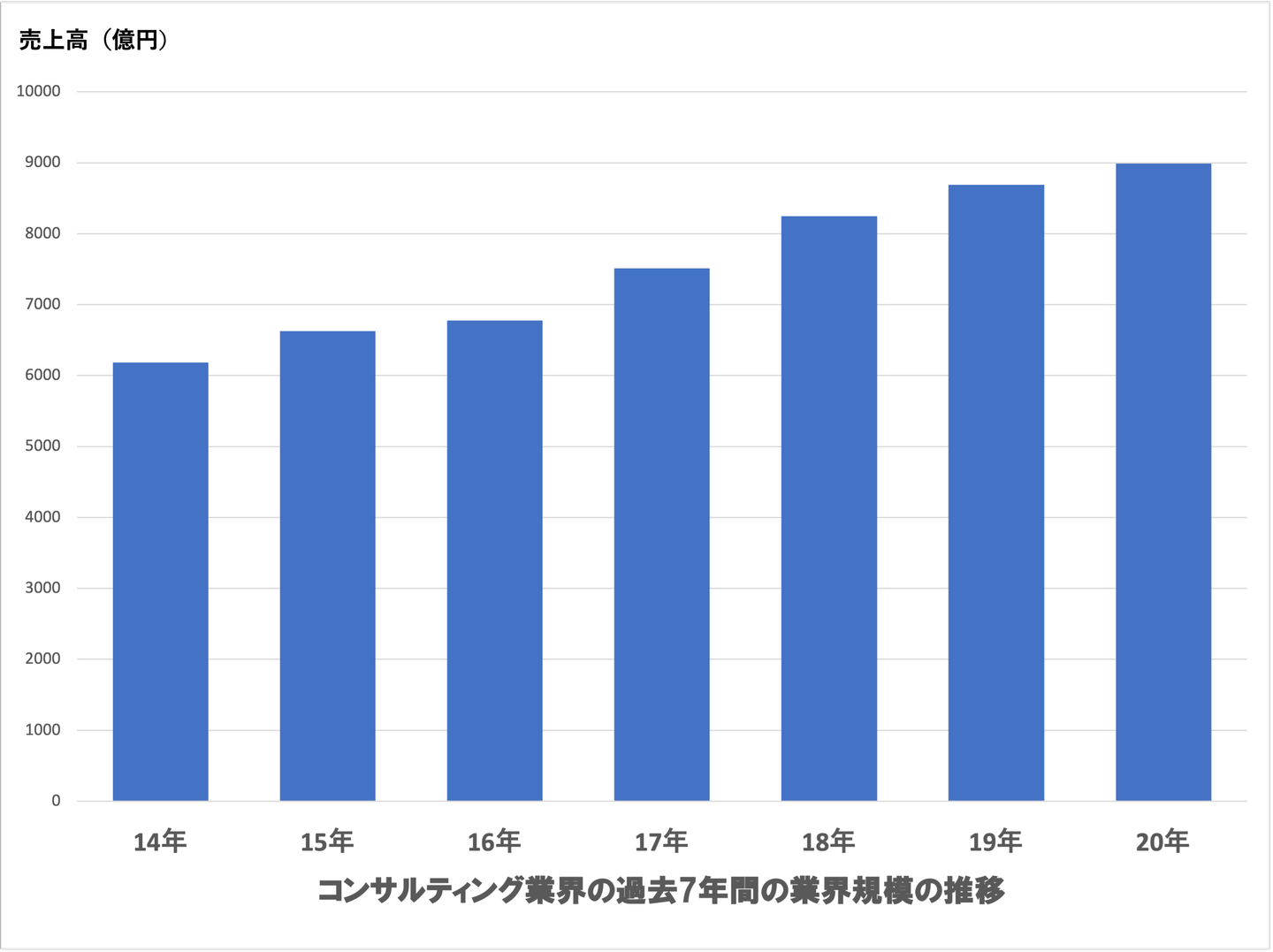 2020年-2021年のコンサルティング業界の業界規模(主要対象企業18社の売上高の合計)は8,987億円となっています。(※業界動向search.comより)