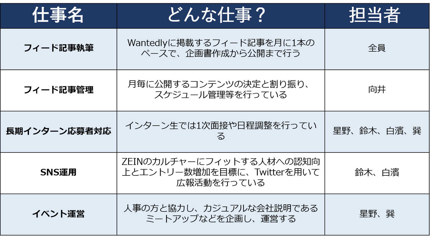 他にも、長期インターンの応募者対応を担当しています。応募者の方から「ZEINで働きたい!」と選んでいただけるように1次面接では業務内容やZEINについて説明を行っています。