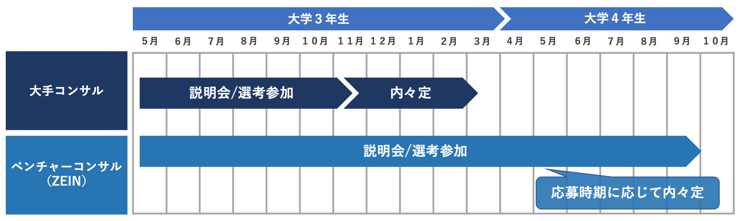 実はコンサルティング業界内部でもベンチャーコンサルティングファームであるZEINでは選考時期が異なり、大学4年生の時期であっても選考に参加できます。