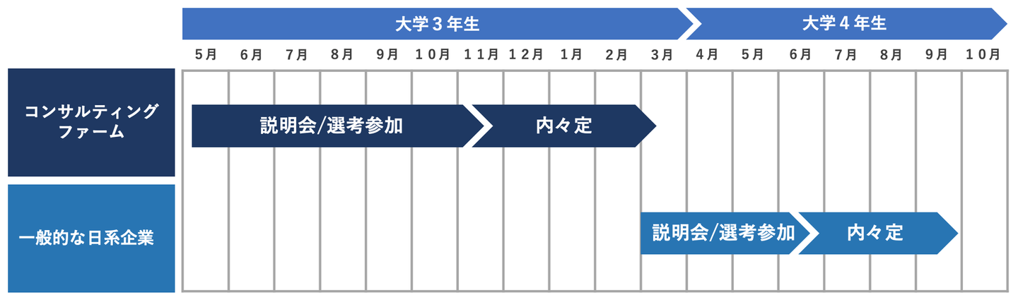まず、コンサルティングファームと一般的な日系企業の選考時期はこちらの図の通りです。