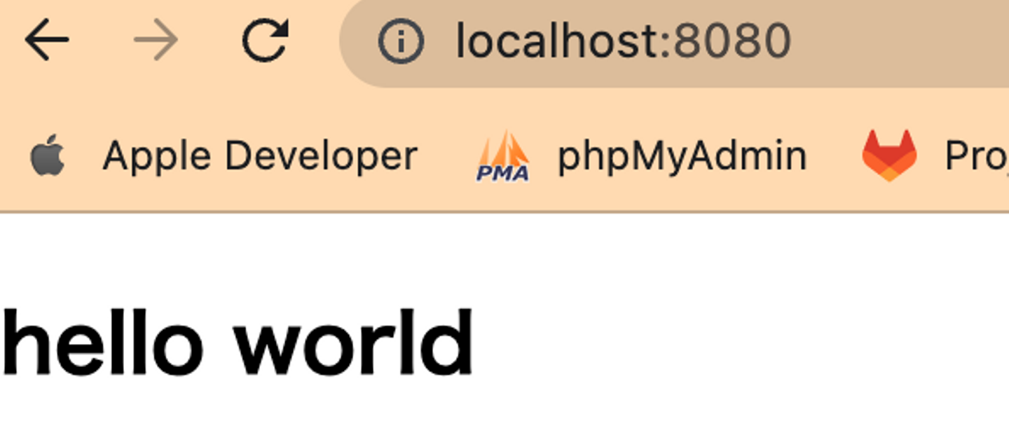 localhost:8080にアクセスすると、hello worldの表示が確認できた