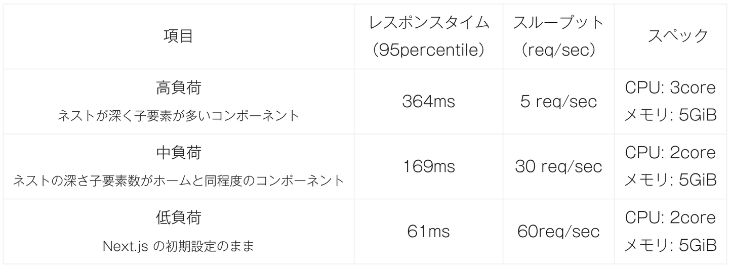 Next.jsの性能試験でレンダリングとスループットの関係性を調査 GoやJavaのAPIサーバーは運用実績があり、性質や運用についてのノウハウがあります。一方でNode.jsを運用するのは初めての試みでした。加えてNode.jsはシングルスレッドのランタイム環境という特性があります。そのため、CPUバウンドなタスクを実行する場合、サーバー処理をブロックしてしまいパフォーマンス低下の可能性があります。具体的には、SSRの処理がCPUバウンドな処理で知られており 5 、この事象が起きてしまえばインフラコストが高くついてしまうことや、パフォーマンス要件を満たせない懸念があると考えました。本番にリリースしてからパフォーマンス要件が満たせないことになれば問題ですので、Next.jsアプリケーションの性能試験を実施しました。