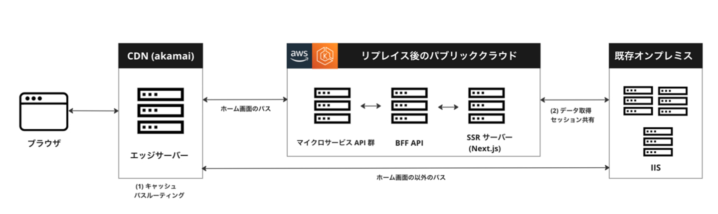 まずCDNを経由してユーザーのブラウザにコンテンツが配信されます。弊社ではCDNにAkamaiを採用しております。このAkamaiでは、(1)キャッシュ、パスルーティングとあるように、コンテンツのキャッシュや、ユーザーのリクエストパスから適切なサービスにルーティングをするパスルーティングなどを行なっています。具体的にはホーム画面のパスをリプレイス後のシステムへ、ホーム画面以外のパスは既存システムにリクエストをルーティングしています。