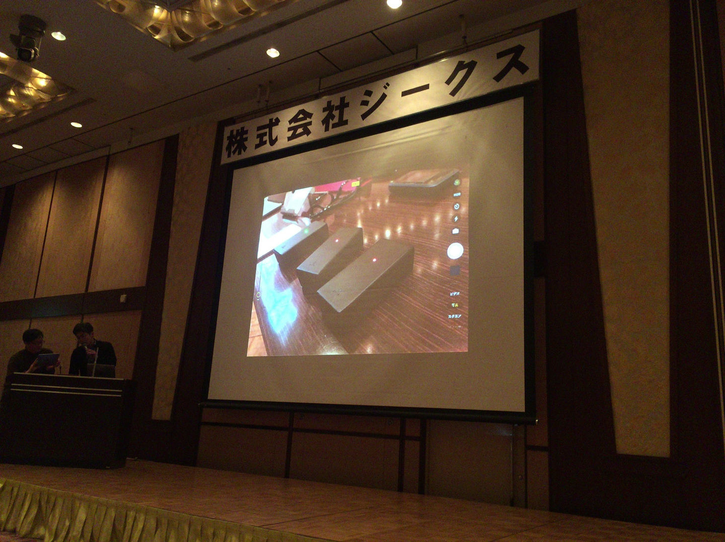 営業、管理部、マネージャーなど、各チームから前年の活動実績と今後の計画について発表がありました。写真はIoTグループの発表で、スクリーンに映っているのはジークスオリジナルbeacon(ビーコン)端末の『Zeacon』です。