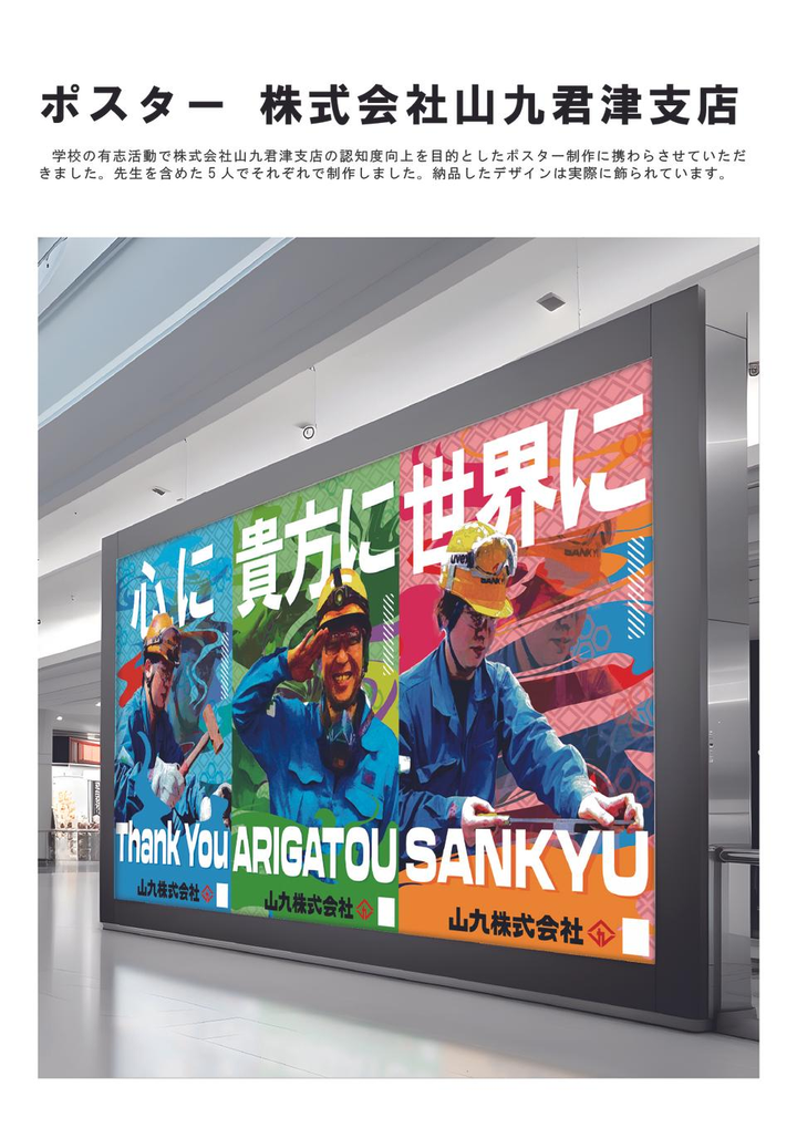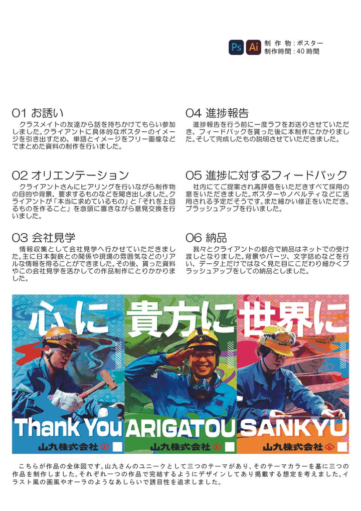 Adobe製品とMayaを中心にグラフィック、写真加工、Webプログラム(HTML、CSS、Javascript)、動画編集、3DCGモデリングなどの学習をしました。また外部の企業からクラスに依頼を受けてデザインを創る「産学連携」を行いました。ポスター制作や動画制作、Web制作などの依頼を受けて要望にお応えします。グラフィック、Web、動画、3DCGのチームに分かれて作業を行う中