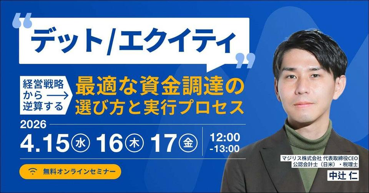 ■■■イベント開催「デットか、エクイティか?経営戦略から逆算する最適な資金調達の選び方と実行プロセス」■■■ マネーフォワード様と共催で、資金調達をテーマにしたセミナーに登壇します! 以下のテーマについてリアルな話をお届けします。 ・デットとエクイティ、どちらを選ぶべきか? ・自社のフェーズに最適なバランスは? ・投資家・金融機関との交渉、実際のところ何かポイントになるのか? 経営戦略から逆算した資金調達の考え方を、できるだけ実務的かつ率直にお伝えできればと思っています。是非ご参加いただけると嬉しいです! 【開催日時】 2026年4月15日(水)12:00~13:00 2026年4月16日(木)12:00~13:00 2026年4月17日(金)12:00~13:00 【会場】 オンライン開催(EventHubにて配信) 【参加費】 無料 【申し込みURL】 https://biz.moneyforward.com/seminar/25148/