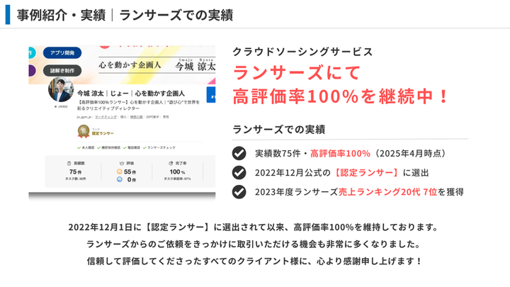 【高評価率100%】75件の実績|認定ランサーとして活動(ランサーズ)