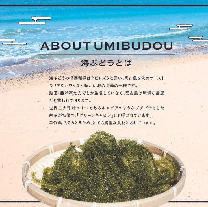 宮古島で生産している海ぶどうやもずくを 全国へ販路拡大のため海ぶどうのリブランディング もずくを活用した商品企画・開発を行い展示会へ出展。 大手量販店や百貨店への新規販路開拓からプロモーションやルートセールスも担っています。
