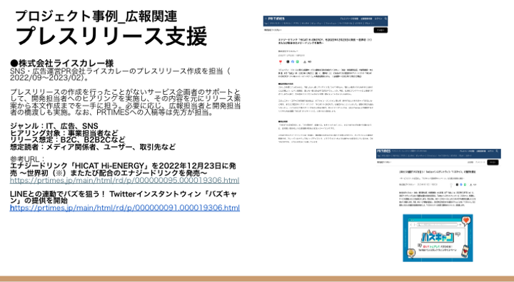 過去に関わったプロジェクトについて、以下3つのテーマからご紹介します。 ☆マーケティング関連 ☆広報関連 ☆メディア関連 ご紹介したPDFはほんの一例のため、ぜひ、ご興味のあるページからご覧いただけますと幸いです!