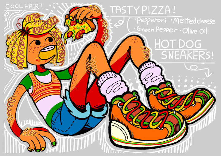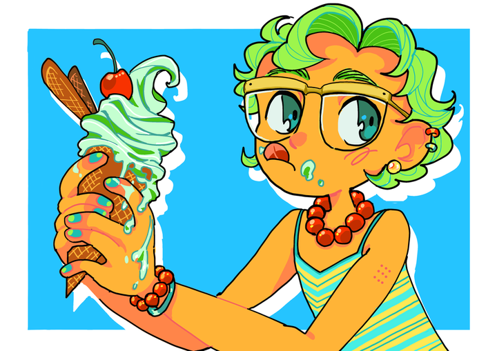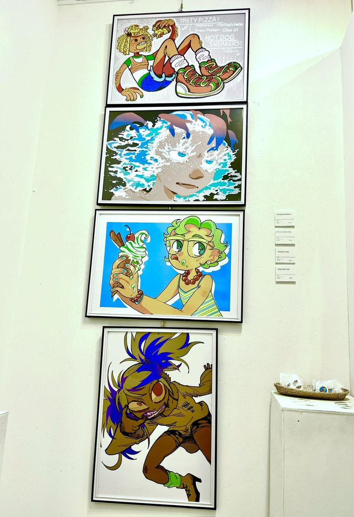 2024 年 5 月にインターネットで知り合った 10 人と参加したグループ展に参加。「女の子」というテーマでイラスト4枚を描き下ろし、全て全く違うテイストかつ、印象に残ってもらえるように絵柄や色使いを工夫して制作。全てA2サイズで印刷、展示。 絵の展示の仕方を考える機会を得た。人に見てもらうということで緊張したものの、その分自信を獲得。 また展示のほかに缶バッジ制作、グッズ販売なども行なった。