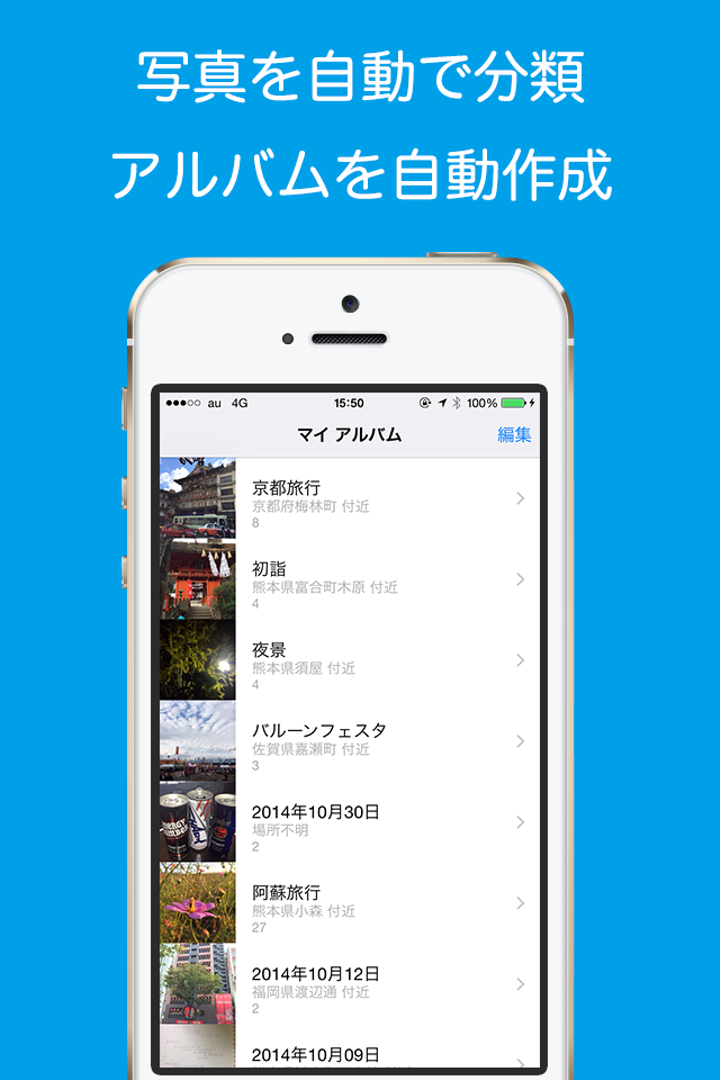 iPhone用iOSアプリケーション『Smart Album(スマートアルバム)』 『Smart Album(スマートアルバム)』はiPhoneに保存されている写真をアプリが自動で整理・分類して出来事に合わせたアルバムを自動で作成します!さらに、Facebookへのアップロード機能もついているので、自動で整理された写真やアルバムを簡単にFacebookで共有することができます! 面倒な写真の整理やアルバム作成はスマートアルバムに任せて、気軽に沢山の思い出を写真に残しましょう! ※ 現在公開終了