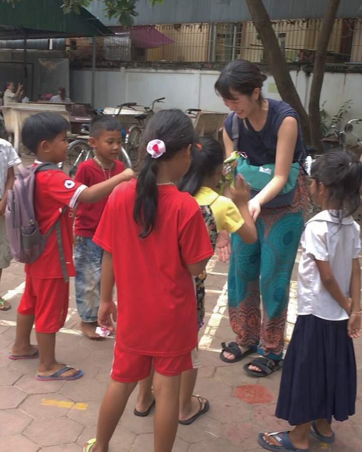 カンボジアの子供達と触れ合っている時の写真です。現地の子の生活、遊び方を知ることがまた世界を知れた機会になりました。