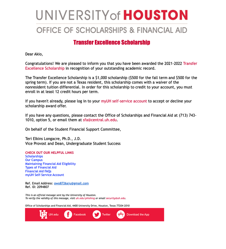 ・成績優秀のため総額$13,216(197万円)になる返済不要の奨学金を毎年度ヒューストン大学から頂く (添付写真はその内の$1000のみ)