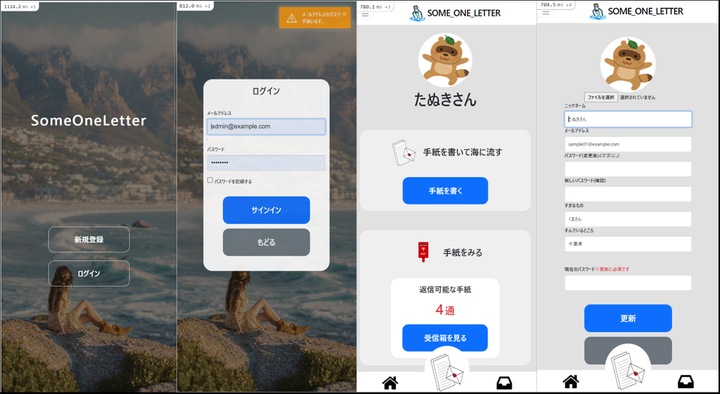 ◆NTTコムウェアを退職後、独学でwebサービスを作成しました。 詳細はgithubをご参照ください。 ◆URL => https://someoneletter.com/ ※コストの都合で、現在サーバーを一時停止しております。 ◆github => https://github.com/makutaro/SomeOneLetter