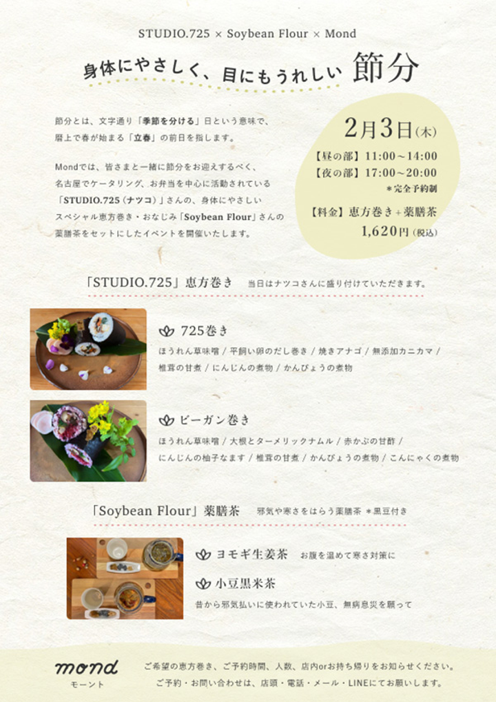 節分イベントを企画、フライヤーをデザインしました。 ターゲットは一人暮らしの30代後半〜40代前半の会社員女性。 平日でしたが予約は完売し、商品を増量していただきました。