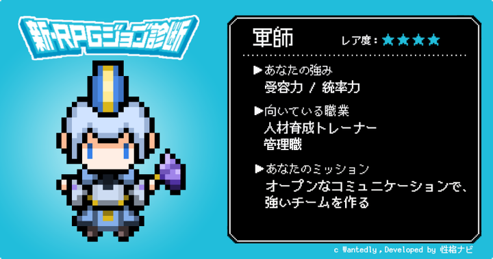 Wantedlyの「新・RPGジョブ診断」の結果は「軍師」でした。