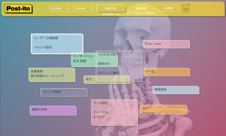 ポストイット改、ポスト伊東 オンラインで付箋作成、書き込み、自由な場所に貼り付け、保存が出来るものが既存に無かったので、自ら作成。 ローカルストレージで保存の実現。 Webならではの透明色も含めて7色、3種類の大きさで21種の付箋作成が可能。 付箋作成時のアニメーションもこだわりました。