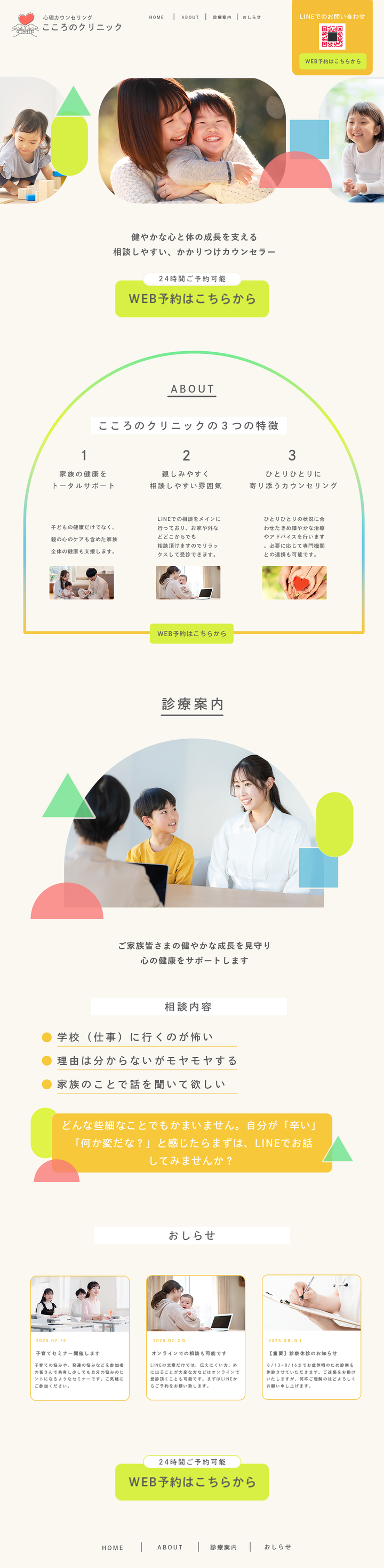 子どものことで悩んでいる家庭を想定に置き心理カウンセリングの開院をしWEBサイトのデザインを制作しました。 ●件与 架空のサービスの概要と、ワイヤーフレームを自主制作し、それを基にデザインしました。ワイヤーフレームは、デザインの書籍や、実際にある病院などでいくつか調べて良い点は参考にさせて制作しました。 ●制作時間 合計1日(約5時間) 内訳:要件定義、ワイヤーフレーム、PC版デザインの制作です。 ●工夫したポイント 柔らかなアイボリーをベースに、彩度の高い黄緑色・水色・赤などのアクセントカラーを使用し全体的に温かみを出し、誰でも相談しやすい雰囲気が出るよう工夫しました。