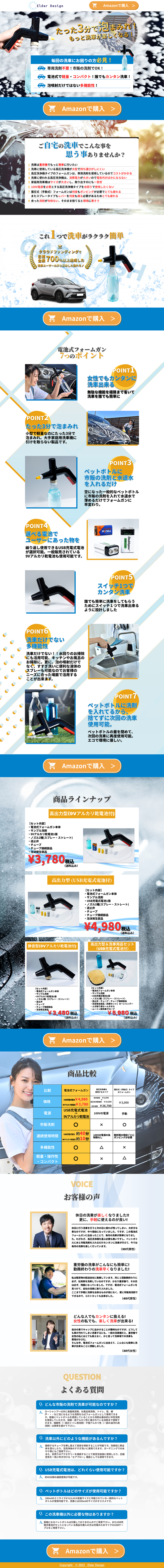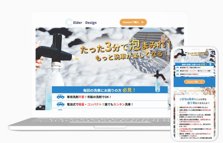 【要望】 ・メインカラー:青 ・スタイリッシュ ・製品の良さを1発で分かるようにしたい 【ターゲット】 ・車好き男性 ・集客導線はリスティング広告メイン 【制作意図】 デザイン制作にあたって私が心がけたポイントは以下の通りです。 ・製品の特徴を際立たせる: 私は各セクションで製品のユニークな機能を強調しました。利用シーンの写真を通して、使用方法とそのメリットを直感的に理解できるようにしました。 ・みやすさと情報の階層化: 読者が情報をすばやく掴めるよう、明確なタイトル、サブヘッダー、そして箇条書きを使い分け、情報の階層を設けました。 ・行動への動機付け: 「Amazonで購入」のようなボタンは、訪問者が即座に行動に移れるように設計されており、その色合いも目立つように選んでいます。 ・情報の視覚化: テキスト情報を視覚的にも伝えられるように、写真やアイコンを用いて情報を可視化しました。 ・価格情報の明示: 異なる製品オプションの価格をはっきりと表示し、比較を容易にしています。