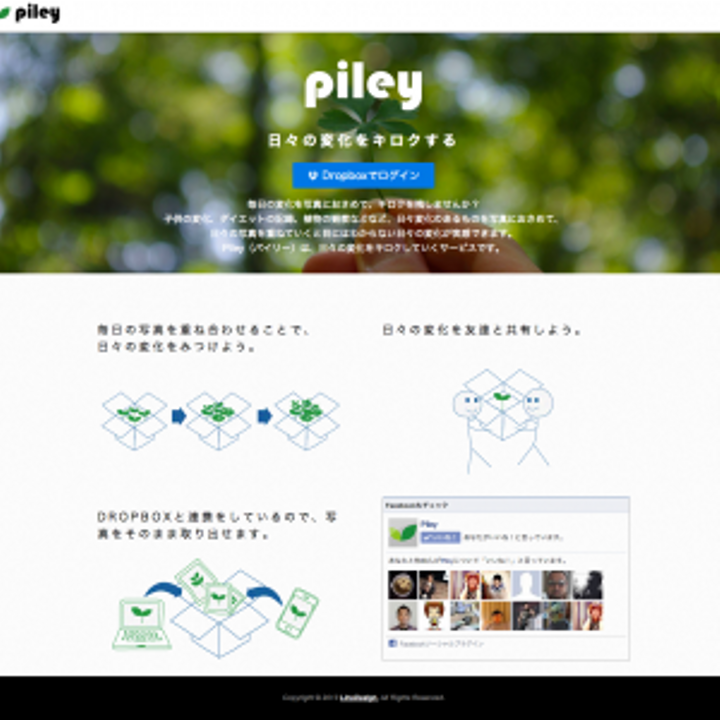 毎日の変化を写真におさめて、キロクを残しませんか? 子供の変化、ダイエットの記録、植物の観察などなど、日々変化のあるものを写真におさめて、 日々の写真を重ねていくと目にはわからない日々の変化が実感できます。 Piley(パイリー)は、日々の変化をキロクしていくサービスです。