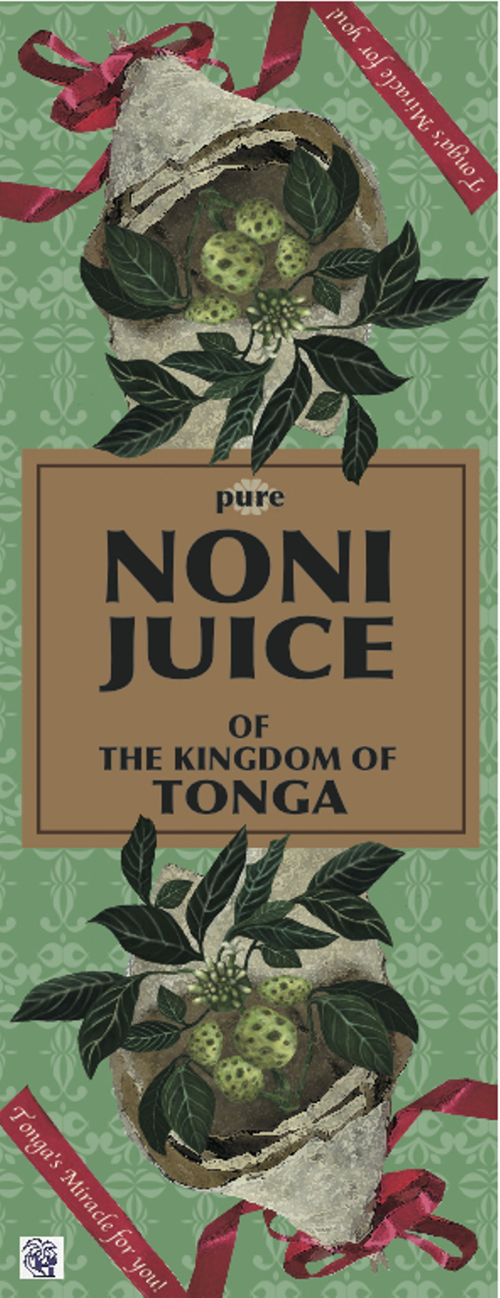 トンガ王国国内で販売されるノニジュースのパッケージデザインを行なった。 トンガの伝統的な樹皮布(タパ)でノニの実のブーケを包み、リボンには英語とトンガ語で「トンガの奇跡をあなたに」と書いてある。背景のデザインパターンは、トンガにある伝統的なデザインを元にしている。