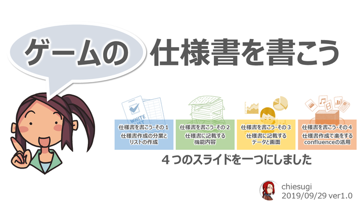 ゲームの仕様書を初めて作成する人のための足掛かりのスライド ・ゲームの仕様書を書こう1 仕様書作成の分業とリストの作成 ・ゲームの仕様書を書こう2 仕様書に記載する機能内容 ・ゲームの仕様書を書こう3 仕様書に記載するデータと画面 ・ゲームの仕様書を書こう4 仕様書作成で楽をするconfluenceの活用