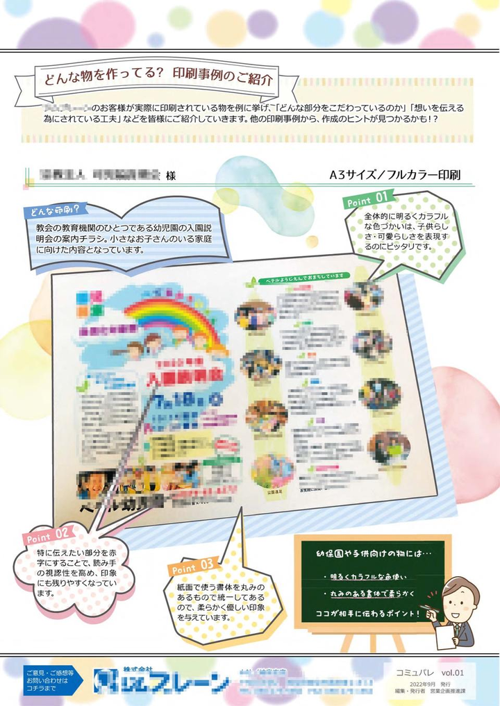 会社で独自に作成発行して顧客に配布している 通信の作成を一から手掛けました。 A4サイズ両面、Illustratorにて作成。 ・コンセプト ・構成 ・紙面デザイン (初回のみ。テンプレート化して、他者も編集できる様にしています) 全てを自身1人で担当しています。