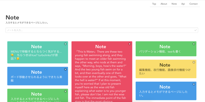 Vue on Railsで作ったnoteアプリ(開発中) バックエンドはRails を APIに。フロント側はAPI 経由でデータを取得して、ブラウザに表示。