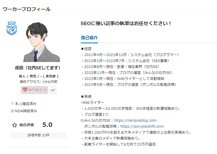 2023年1月から副業でライター活動をはじめ、7月にプロクラウドワーカーに認定されました!