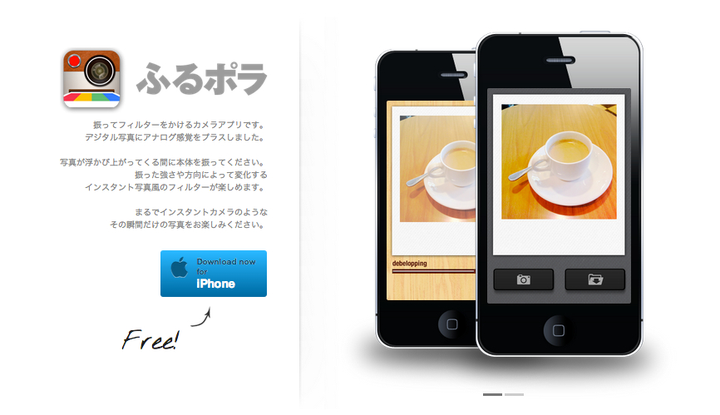 オリジナルアプリです。 世界で5万ダウンロードくらいされました。 ですが、ポラロイド社より商標侵害の疑いがあると連絡を受けたので、現在はストアから取り消しています。 「ふるフォト」などにして再リリースを予定しています。