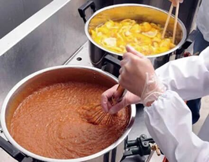 ゆず味噌の製造現場で日々煮込みの作業を担当しています。 原材料の御膳みそ・てん菜糖・ゆずペーストがそろったら、鍋に入れて煮込みますが、このときの配合・スピードと温度が、ゆず味噌・柚りっ子の味の決め手です。 厨房いっぱい、ゆずの香りが広がります。