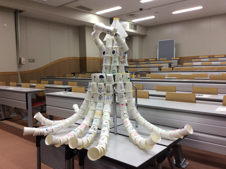 2020年ロボットコンテスト出場ロボット 紙コップで製作 函館の「港まつり」の風物詩である「イカ踊り」を踊るロボット 「港まつり」が中止になってしまったので地元を盛り上げるために制作 紙コップには地元の子供たちのコロナ終息への願いが書いてある