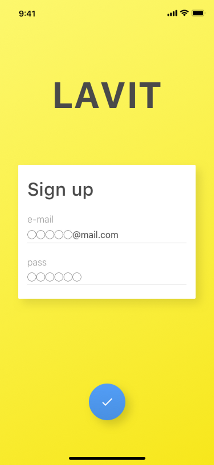Sign up 学校の課題で作成したアプリの画面のサインアップ画面です。 メインカラーが黄色でしたので、背景に黄色一色でデザインしてみたのですが、眩しすぎて失敗しました。 iPhone Xの下部に置くボタンの位置がどこにすれば最適なのかわかっていません。