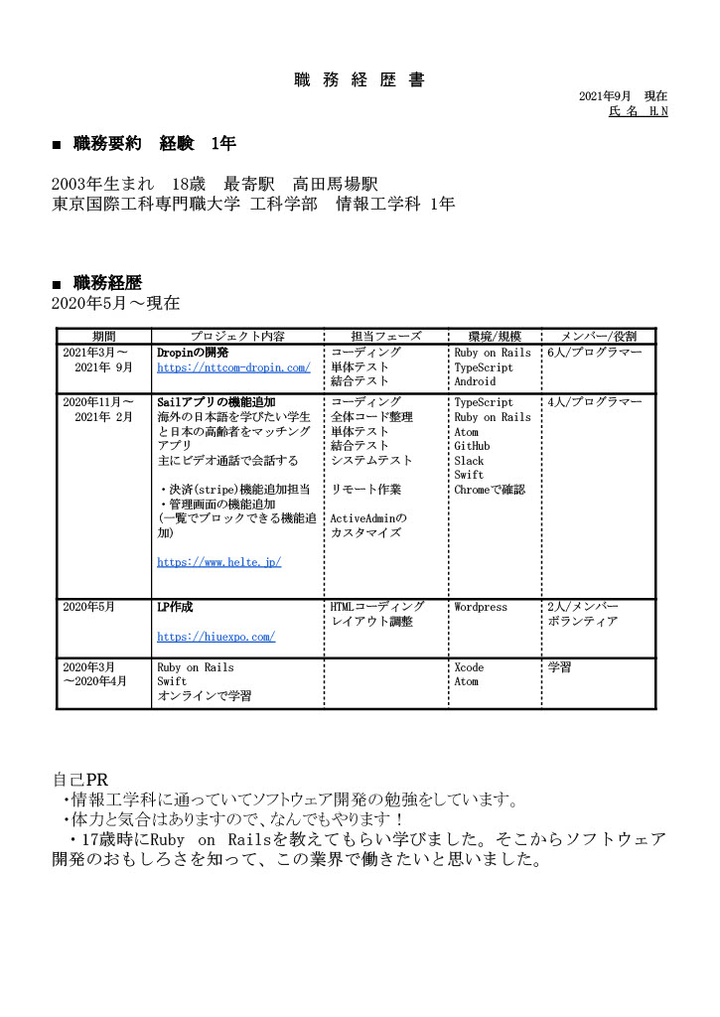 2003年生まれ 20歳 最寄駅 高田馬場駅 東京国際工科専門職大学 工科学部 情報工学科 2年 -> 休学 -> 中退 -> シンプルフォームエンジニア