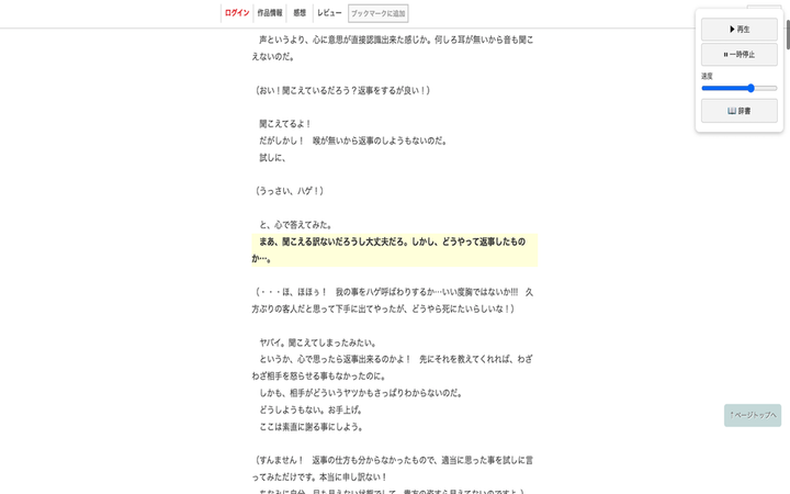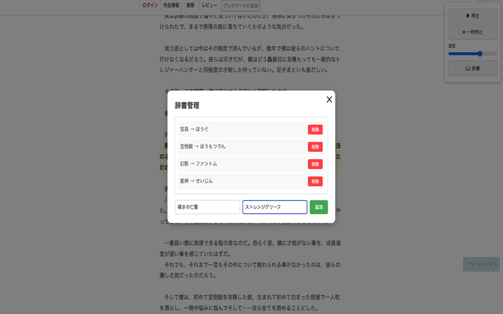 『小説家になろう』の作品を読み上げできる拡張機能を作りました。 自分が読んでいた際に読み上げが欲しくなり、しかし既存のものだとライトノベル特有の特殊な読みをする単語に対応していなかったので作成しました。 これまでのスマホアプリ制作とはまた違った新しい経験になりました。