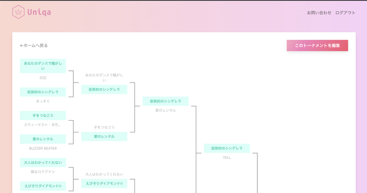 自分の好きなアーティストや曲をトーナメント形式で決めることができるサービス。 SNS でトーナメントを自作してシェアしている人を見かけて流行るかなという気持ちで GW 中に作ってみました。 遊んだトーナメントは Twitter に共有することができます。 使った技術は Nuxt.js, Firebase など。