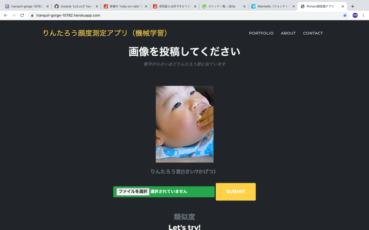 【開発環境(言語、ツール、OS、DB、サーバー)】 python, flask, anaconda, SQLite, heroku 【内容】 機械学習ライブラリを使用した、ある乳幼児に顔がどれほど似ているかを判定するアプリ。 【企画背景】 今後のキャリアを考えるにあたって、今後のビジネスで重要技術になるであろう機械学習について学習したいと考えたことがそもそものきっかけです。また、自分の子供が誕生した際に、病院にて新生児を区別する手法として、母親の名前をサインペンで身体に書く、腕にタグをつける、というアナログな手法を目の当たりにし、取り違えについて不安に感じました。新生児の顔認識をアプリで行うことで、将来的に、親や病院側の不安の解消、また、新生児への身体的負担や作業量の減少に繋がらないか、と思い、その第一サンプルとして作成しました。 【工夫点】 顔認証の精度を高めることを目的とし、学習用データのサンプル数を増加させるため、pythonのライブラリを利用した、画像編集を導入し、精度を改善することができました。