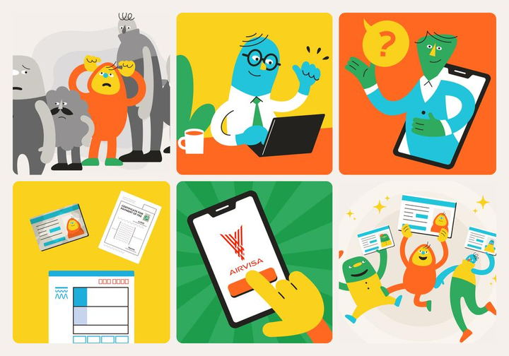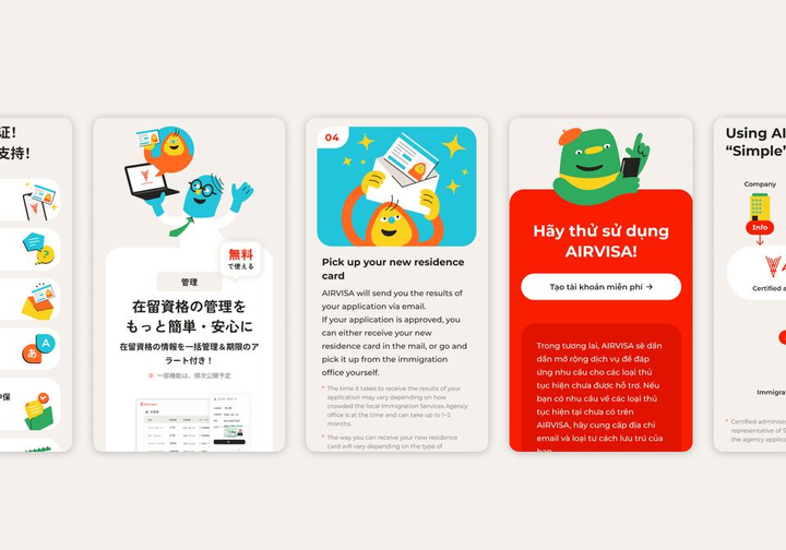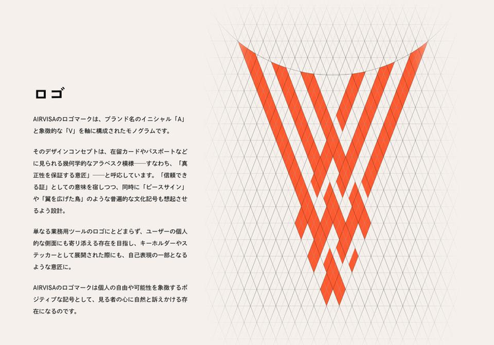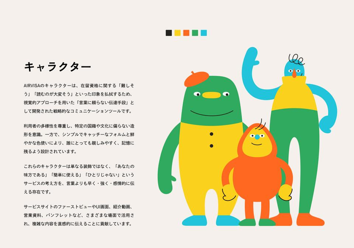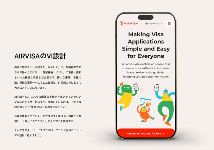 外国籍人材向けに、在留資格の管理申請をオンラインで完結させるサービス "AIRVISA"(SmartHRグループ会社)。そのサービスとコーポレート両側面において、ロゴデザイン / ミッションの言語化 / バリュー策定 / キャラクターデザイン / 多言語展開可能なサービス紹介動画など様々な領域でデザインとクリエイティブディレクションを担当。ブランディングを総合的に手掛けました。