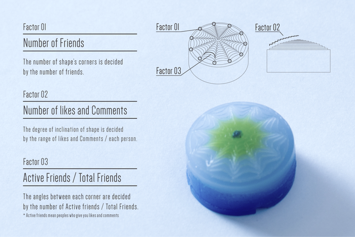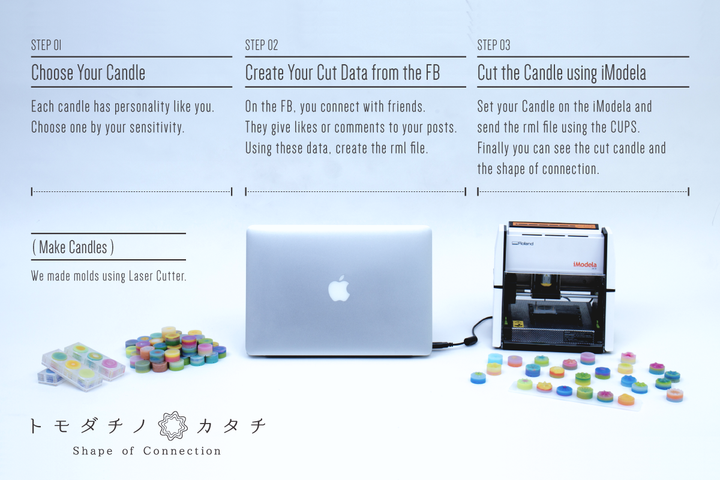 本作品では、データを視覚化するシステムを製作しました。ユーザーは、まず自分に似ているろうそくを選びます。次に、Facebookデータを基に、システムがiModela用の加工データを作ります。最後にろうそくが加工され、ユーザーのつながりの形が現れます。 本作品は、Art Hack Day 2015 の作品として制作され、その後 YouFab Creative Hack Award 2015 にてファイナリストに選出いただくことができました。