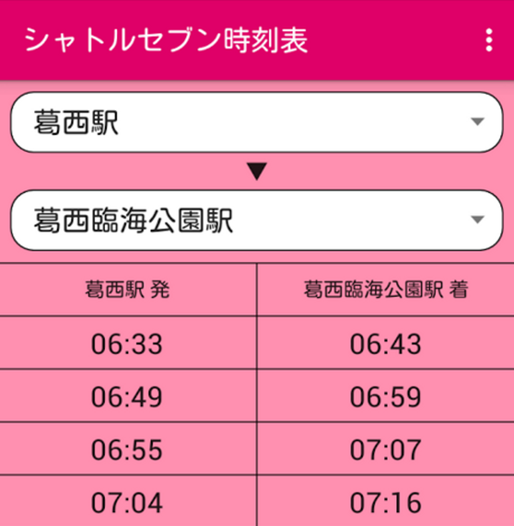 環七通りを走る、亀有、小岩、葛西、東京ディズニーリゾートを結ぶ快速バス、シャトルセブンの時刻表です。 このアプリは非公式アプリのため、アプリに関することは京成バス株式会社ではなく、アプリ製作者へお問い合わせください。