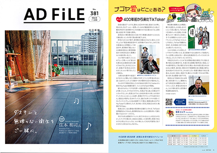 2021年4月より、中日新聞社広報局発行の広報誌『AD FiLE』にて『ナゴヤ愛はどこにある?』を連載中。お陰さまで好評につき、従来この枠ではなかったWebページ(リンク)を作っていただけました。 取材対象として、名古屋おもてなし武将隊、業務用パンメーカー、安城市図書館など。今後もエンタメ業界の人々や作家などが登場予定。