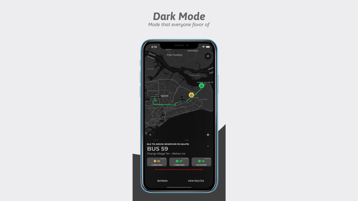 • This app enable user to check bus arrival timing to see if they’re running late, plan bus journeys with total ease and view nearby bus stops from anywhere in Singapore. • Features include toggle between dark mode, show nearby bus stops, calculate distance between bus stop and arriving buses, show arriving buses’ location in the map • This app written in Swift. • Used Material Component, GoogleMap iOS sdk, apple location manager api, Google Admob and Firebase Analytics.