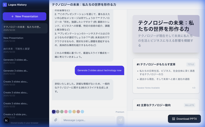 Logos (画像: スライド生成画面のスクショ) 期間: 2025年11月 〜 現在 【概要】 「思考の整理から資料作成までのプロセスが断絶している」という課題を解決する、AIプレゼンテーション生成ツールです。 【技術的なこだわり】 Next.js 14とVercel AI SDKを採用し、チャットの対話内容からリアルタイムにReactコンポーネントを描画する「Generative UI」に挑戦しました。 また、DBレスでデータをURL共有できるアーキテクチャを採用し、サーバーコストを抑えつつスムーズなシェア体験を実現しています。現在はOSSとして公開し、GitHubでスターを獲得しています。 【担当領域】 Full Stack (Next.js, TypeScript, AI Integration)