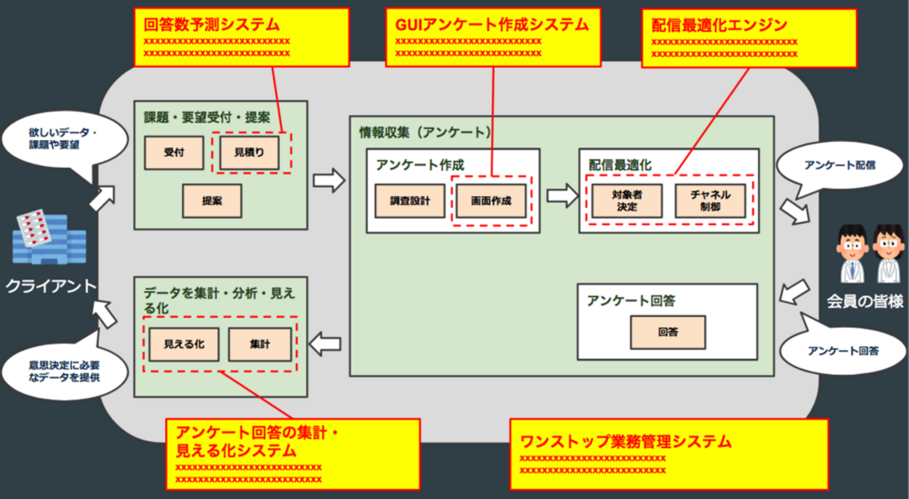 当グループは主に、「会員の皆様にアンケートにご協力いただき、集まった情報を元に、クライアントの課題を解決していく」というサービスを提供しています。 少し前に、グループの経営メンバーで相談し、 「ここ数年業務プロセスが大きく変わってない」→「今までのやり方じゃダメだ」→「やり方を変えて抜本的な業務プロセス・システム改革を進めよう」 という感じで、開発方針を転換したので、その取り組みについて紹介させていただきます。