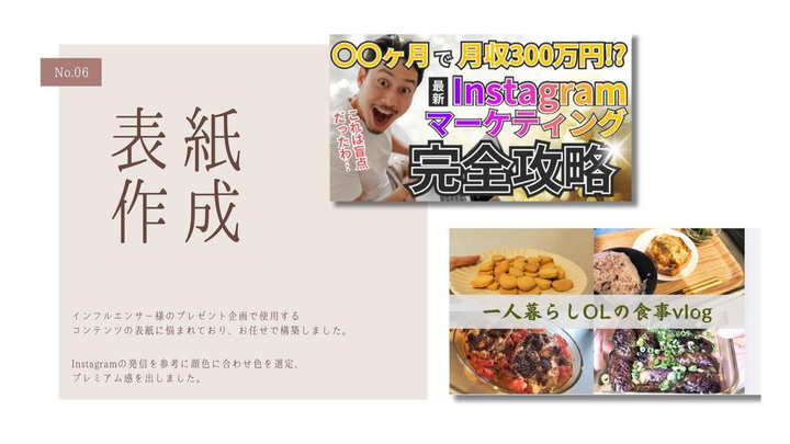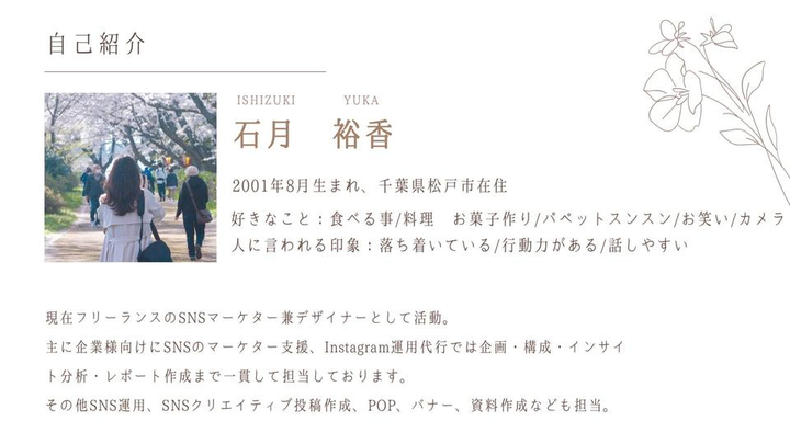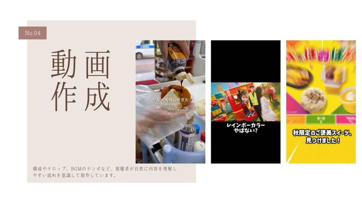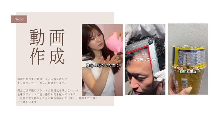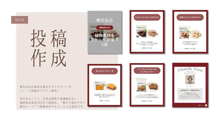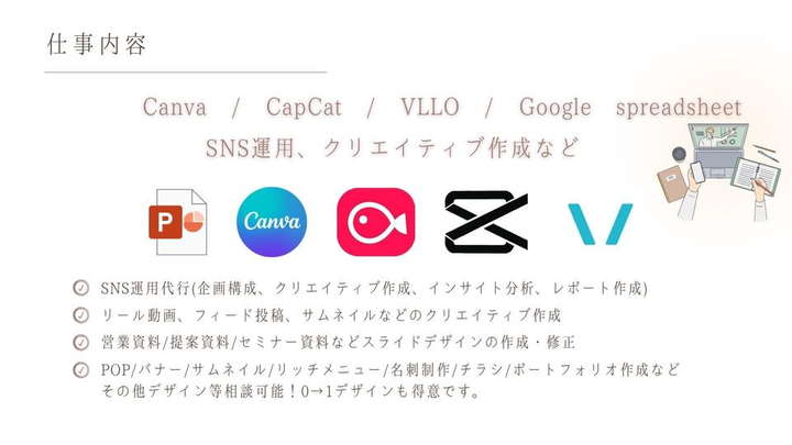 主にCanva・Capcatなどを使用して、以下のようなクリエイティブを制作しております ・女性向け(美容・ライフスタイル系)のスワイプ投稿、リール動画、チラシデザイン ・商品の魅力を引き出す構成・色使い・余白設計 ・初見でも内容が伝わる読みやすいレイアウト ・長期運用に対応できるテンプレートの型設計 投稿に使用するテキストやキャッチコピーも、構成からライティングまで一貫して対応しています。 一過性ではなく、継続的な運用を見据えたデザインを意識しております。載せきれない部分もありますのでぜひ一度ポートフォリオURLからご覧いただけますと幸いです。