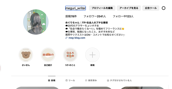 個人で運用しているアカウントです。 ・Webライター向けノウハウ ・フリーランスの裏側 などを発信し、現在ではDM経由でお仕事のお問い合わせをいただけるまでになりました。
